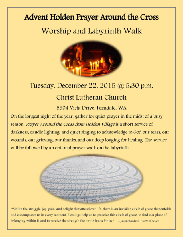 Advent Labyrinth Walk on Sun Dec 11, 4:30 - 5:45 PM at St. Andrew's Episcopal Church, 111 NE 80th St, Seattle. Click here for details.