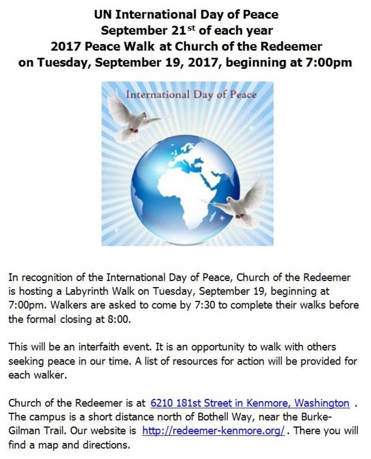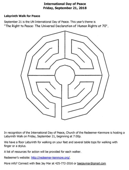 September through May, Church of the Redeemer (6211 NE 182nd St, Kenmore) offers guided labyrinth walks on the second Tuesday of the month, 7:00 to 8:00 pm. The labyrinth is open to the community.
